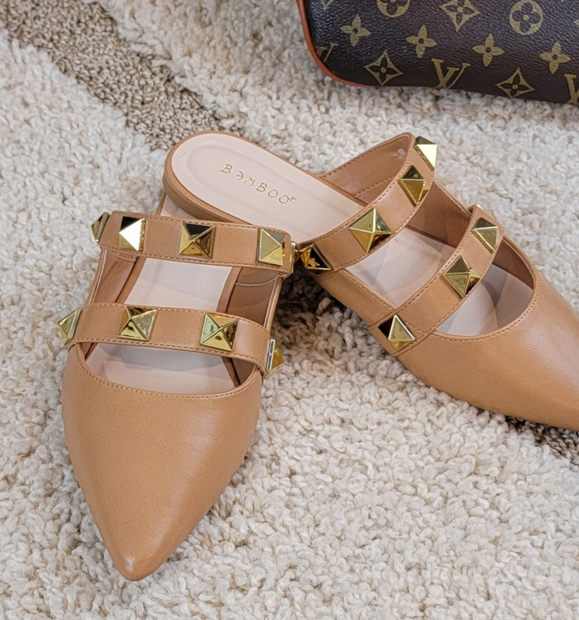Product Description: Walk with sass and style! This cute, comfortable mule may have a flat heel but is not flat in style. The pointed toe brings the comfort, while the studded straps bring the style! This cutie is made with leather-like material and gold toned, medal hardware that gives you just the right amount of sass!